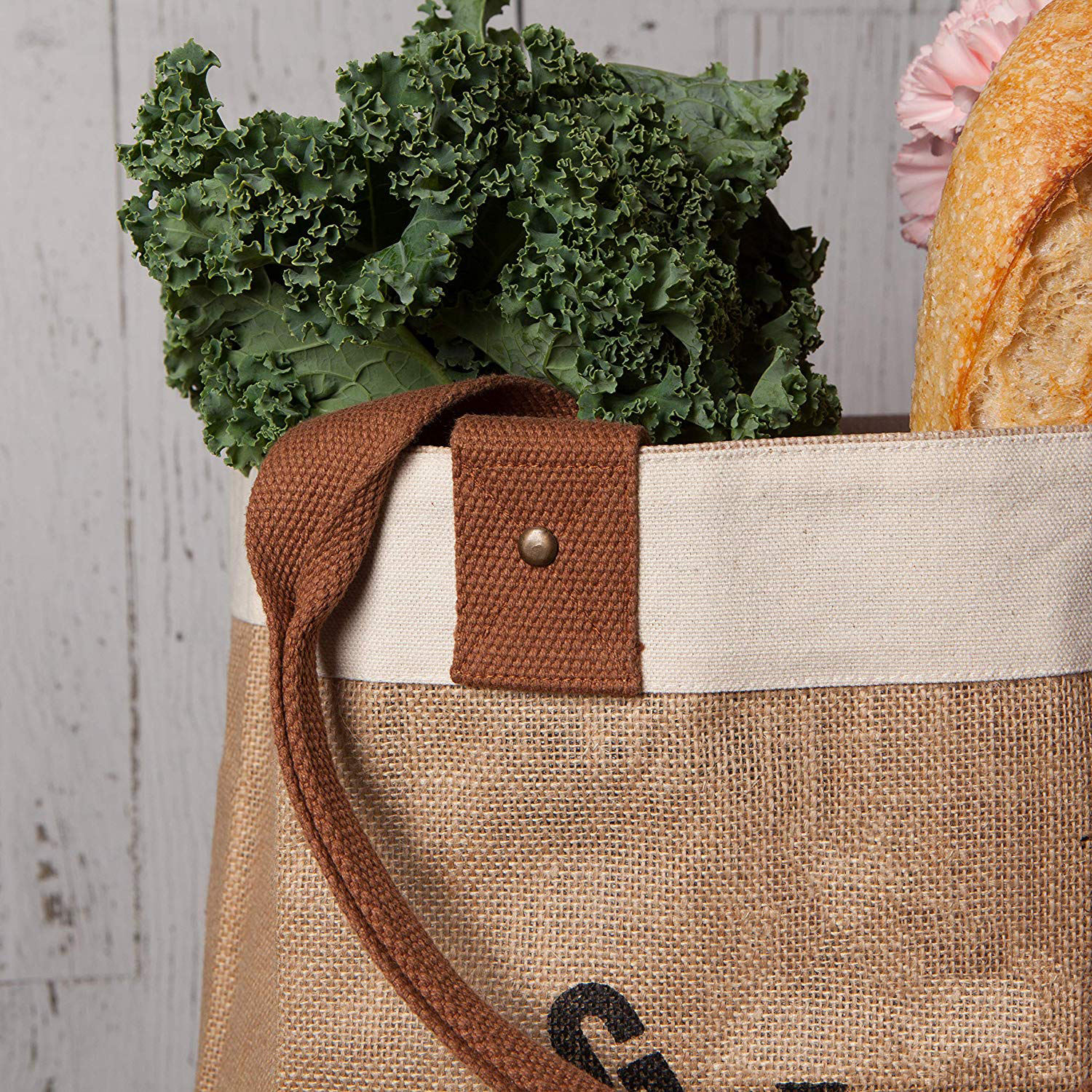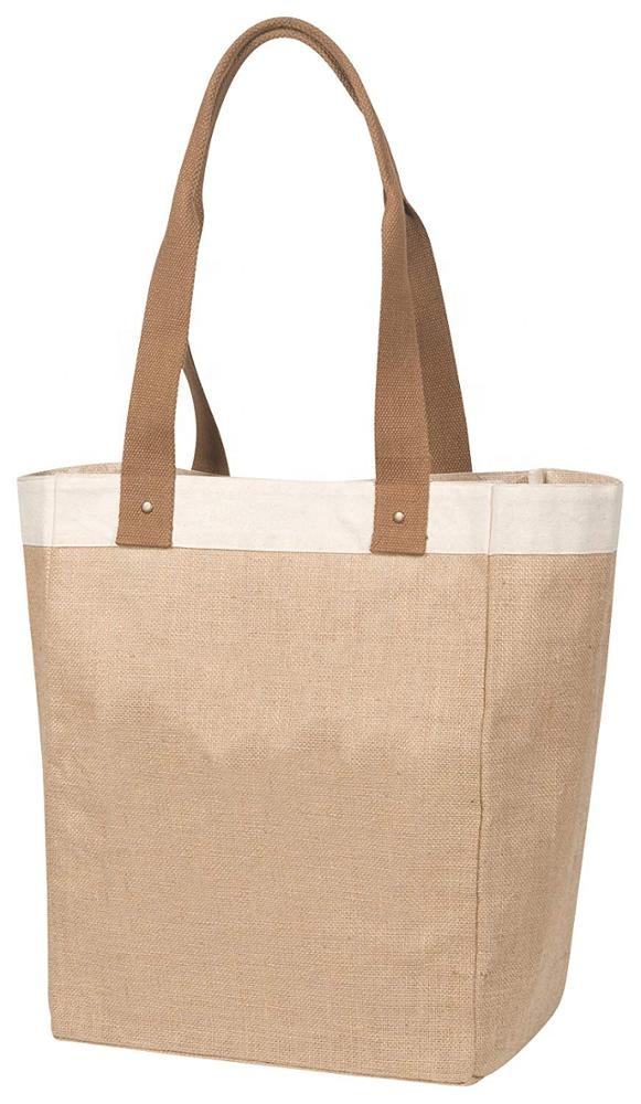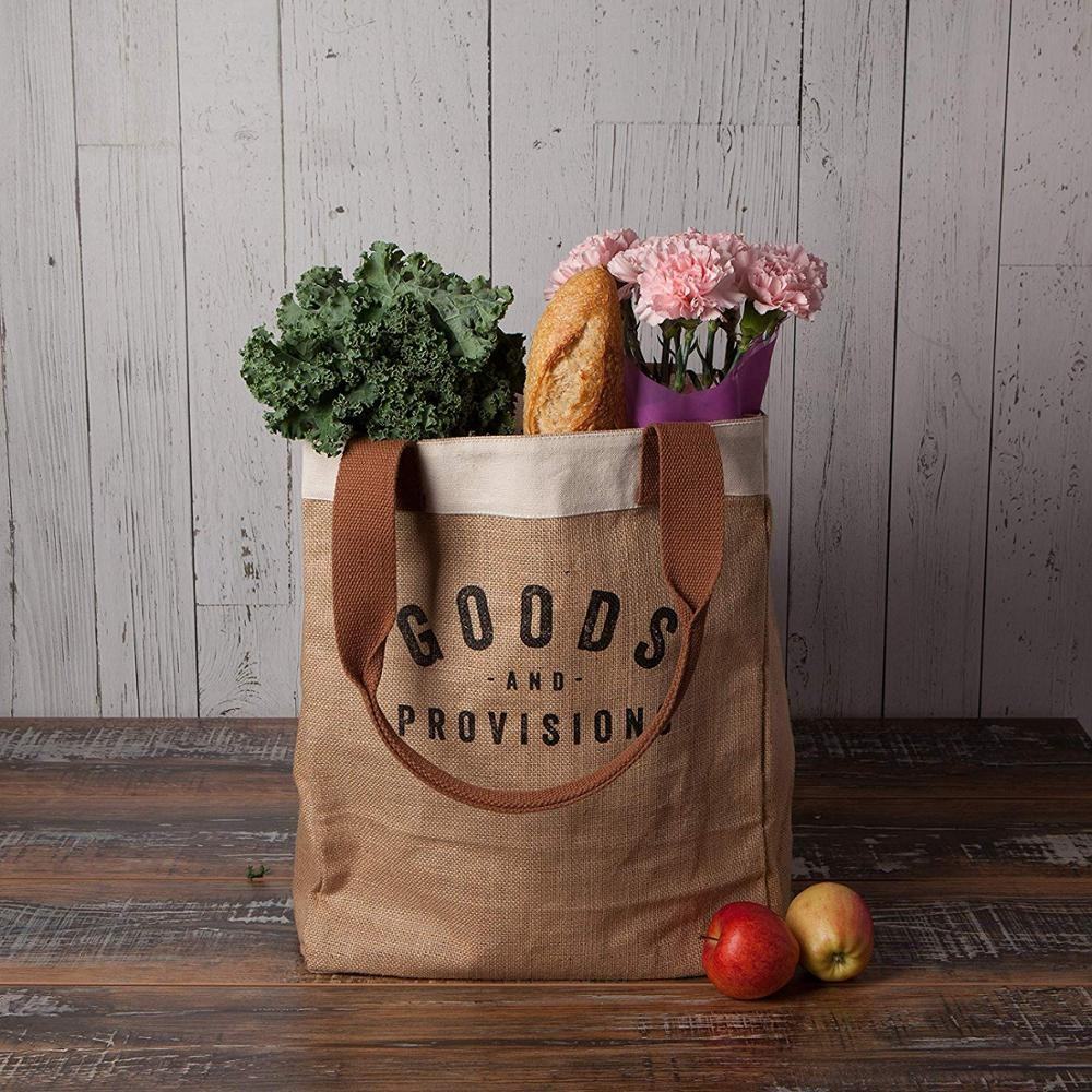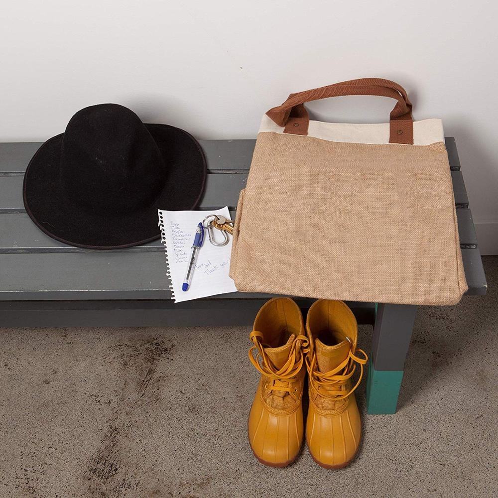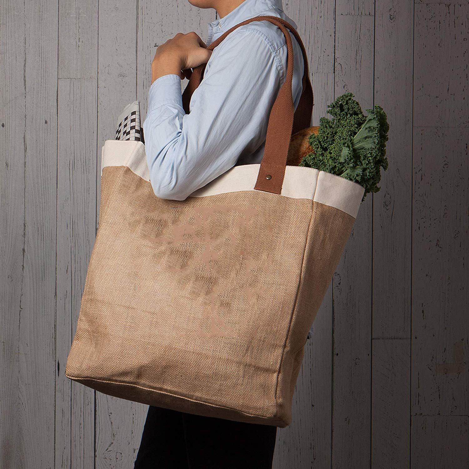 Borsa della spesa riutilizzabile Borsa della spesa Tela di iuta di cotone con manico in pelle - Fodera interna laminata resistente all'acqua