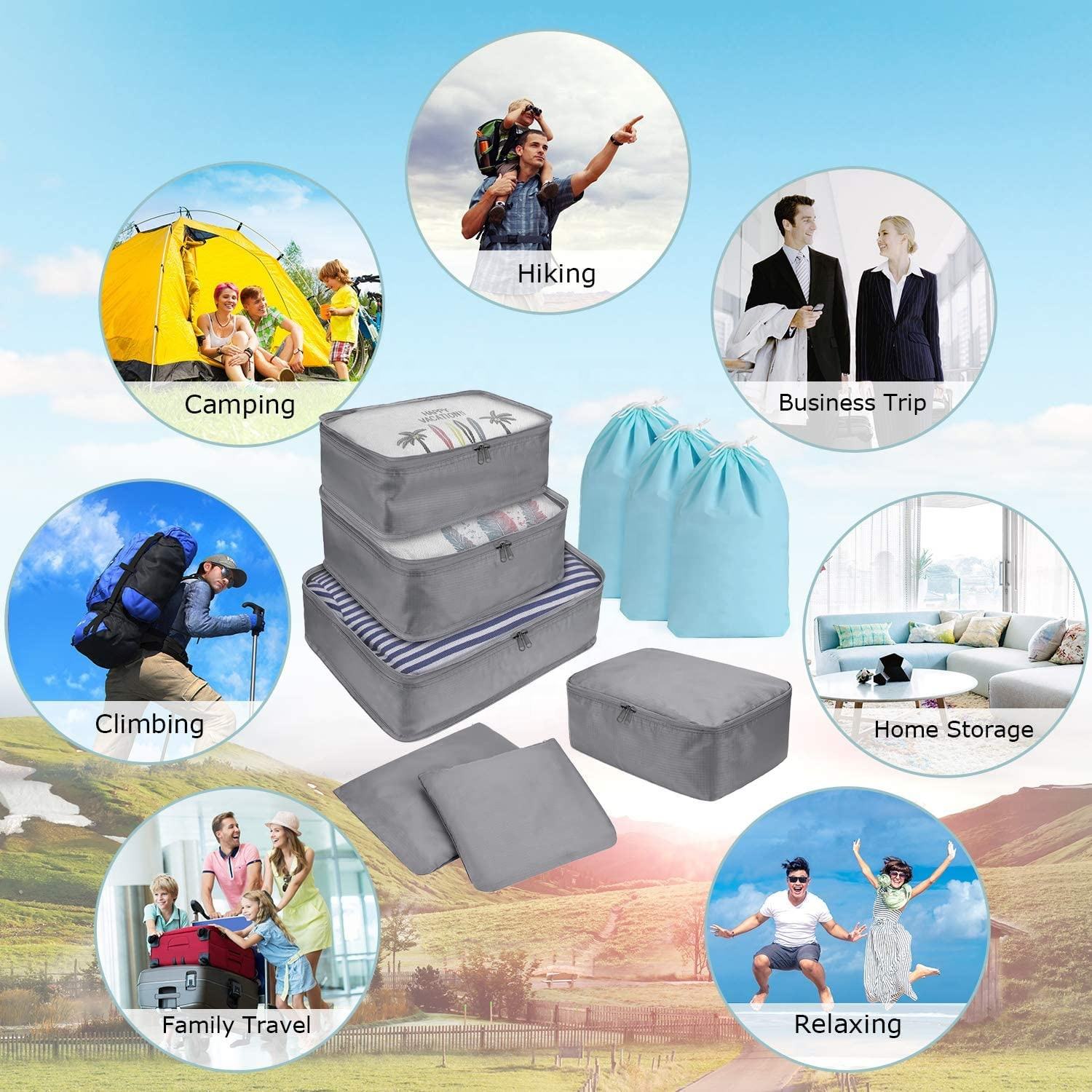 Confezione da 8 cubi promozionali di alta qualità per l'imballaggio dell'organizzatore di bagagli, set di cubi da viaggio da campeggio per l'imballaggio