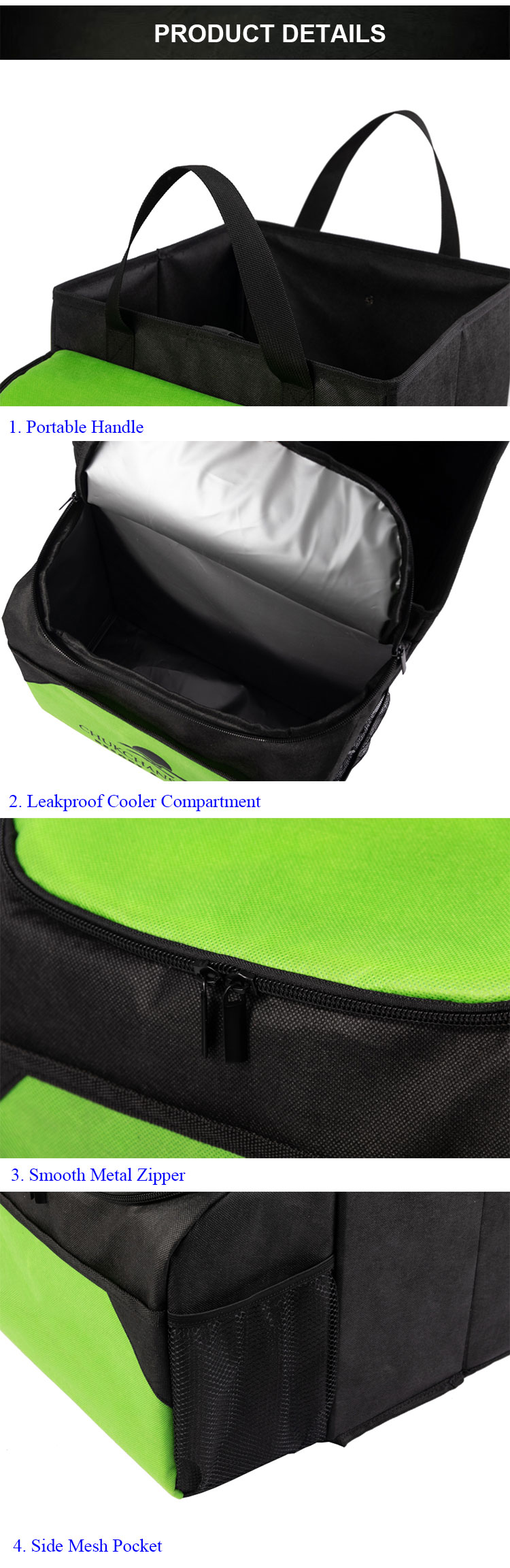 1. Scomparto e dimensioni: Scomparto principale + borsa termica + tasca laterale .Dimensioni: 31,75x46,8x31,75 cm